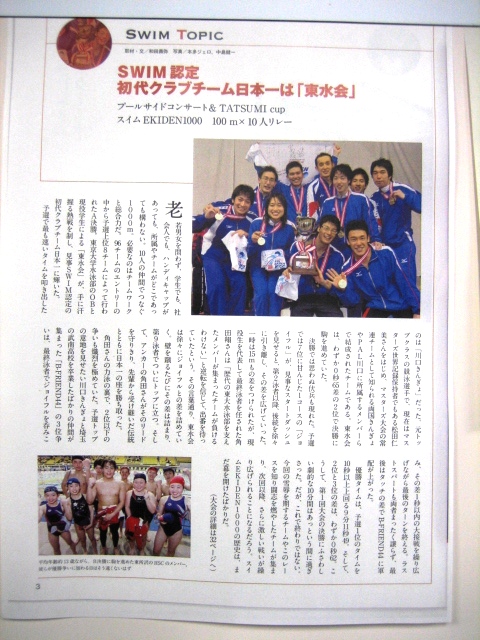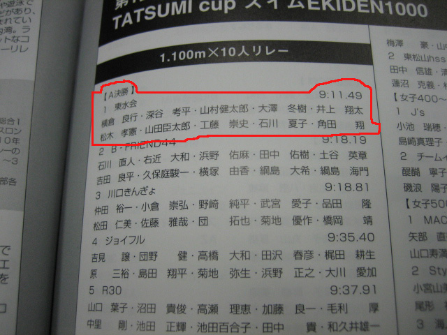 なんと「SWIM駅伝1000 100m×10人」の第一回大会で優勝したとのこと。