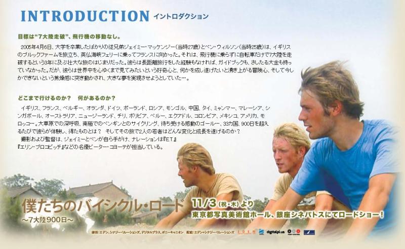 この映画は2人の青年が大学を出てすぐ就職をすることに疑問を持ち、何かチャレンジをしたい、、ということで何がいいか、、と考えた末、「自転車」を使って「七大陸を走る」というもので、彼らが走りながら、いろんなことを考え、悩み、人と出会ったりしながらゴールするまでをドキュメンタリー式に撮影し、本人たちが語っている。見ごたえがあるかどうかは、見た人の判断によるけど、私はみんなにも時間があれば見てもらいたいなあ、、と思いました。