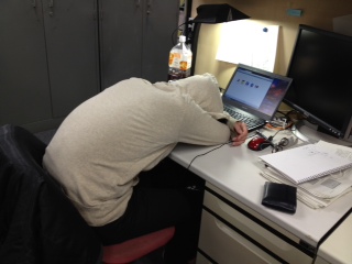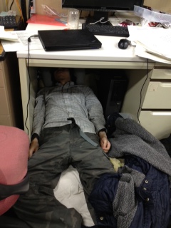 とりあえず提出し、疲れきったB4(3名)とそれをサポートしたM1(1人)と、提出後すみやかに帰宅して休養中(シュラフ)、なぜか余裕の音楽鑑賞中のB4(1名)の図。