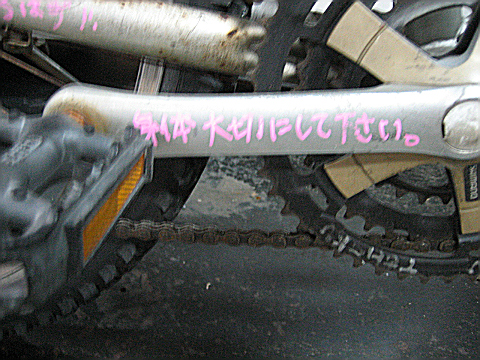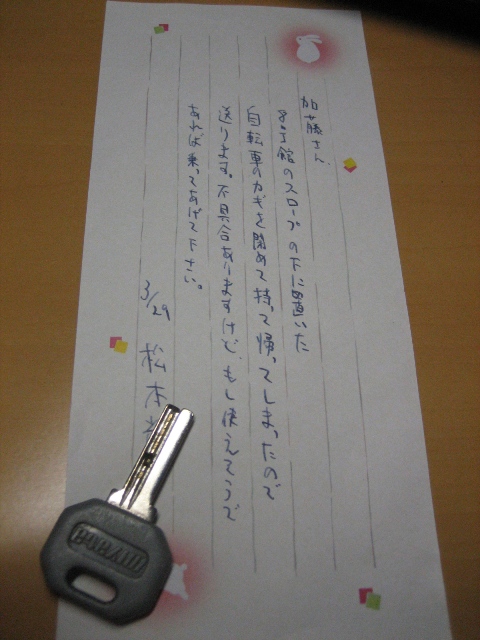 コウイチ君から届いたメッセージとママチャリの鍵。