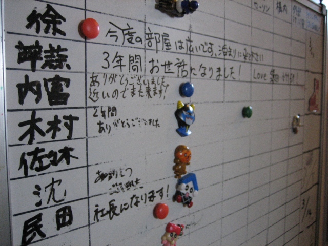 それはさておき、、、今日、来て見ると、就職していったM2(一人はDとして研究室に残ってくれました)のメッセージが行き先掲示板にかかれていました。